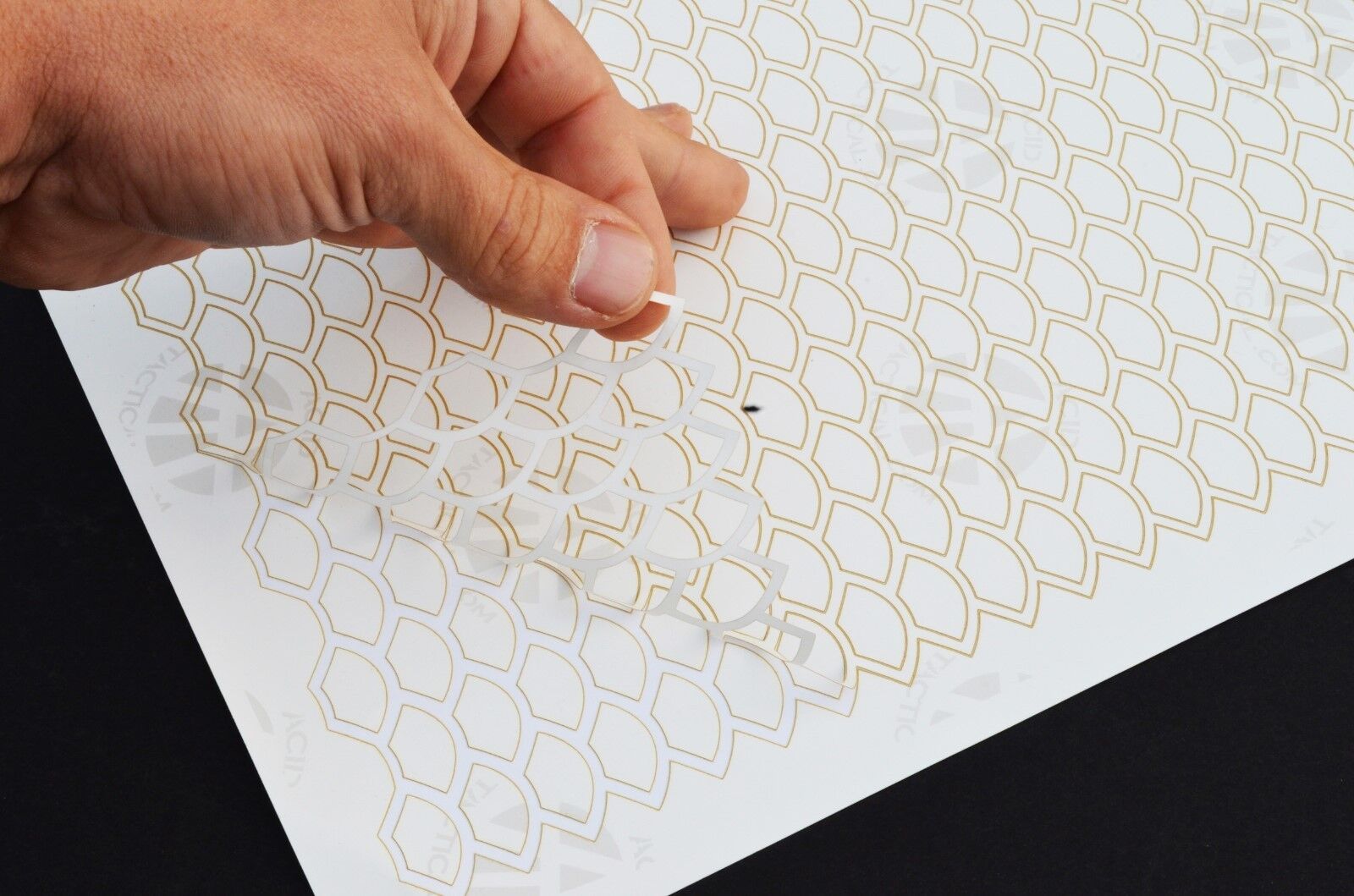 For angled surfaces: When shaping around corners use larger stickers and allow half of the sticker to lay on each plane. If small sections of the design overlaps a corner it may not adhere well. Use scissors to trim any excess that doesn’t want to adhere.