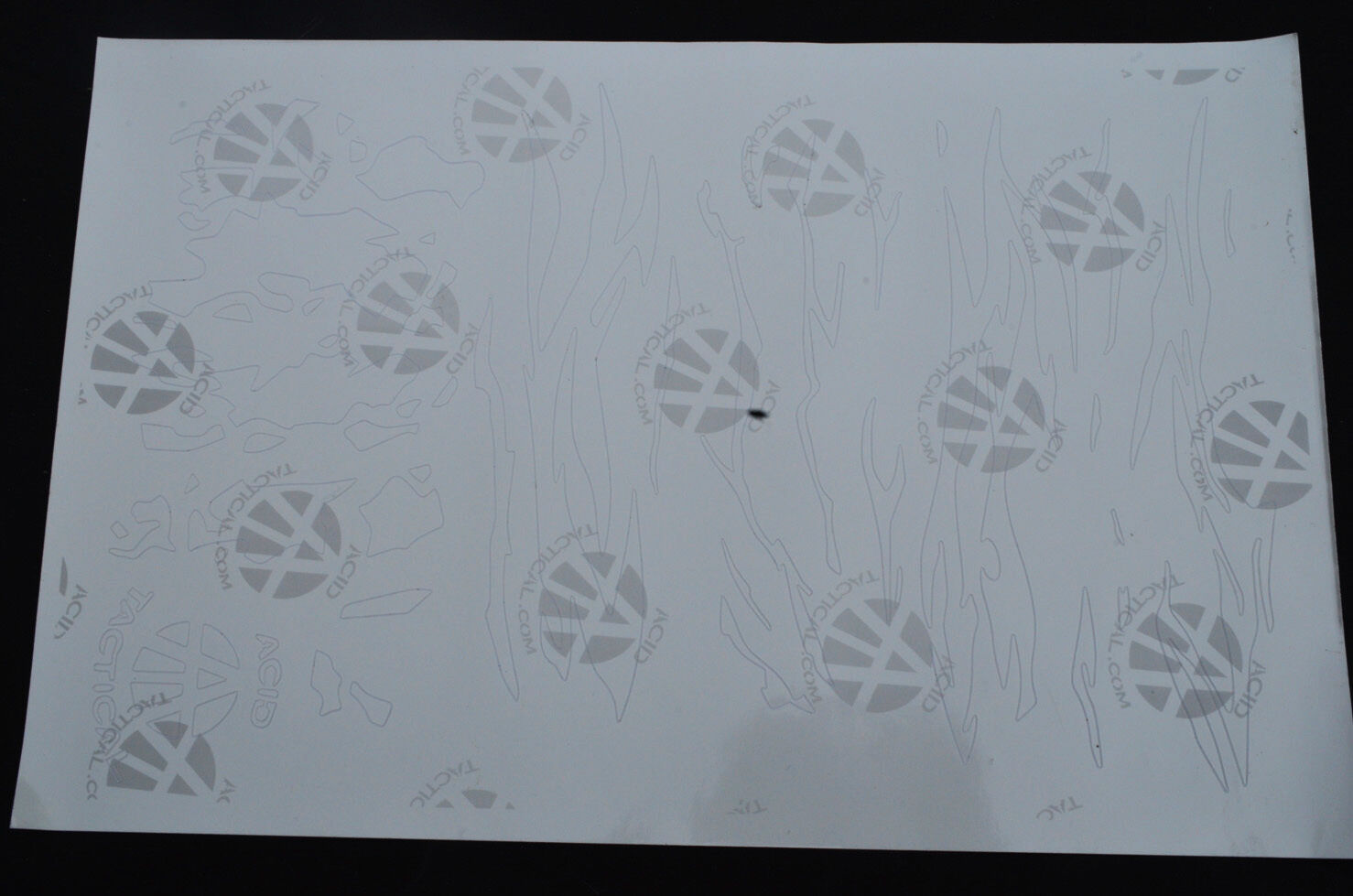 Acid Tactical ADHESIVE camo stencils. Our stencils will not leave sticky glue residue behind. They were designed to remove cleanly and not effect the paint. For use with airbrush, spray, gun coatings, duracoat, cerakote, and other spray paints. Stencils are heat resistant on both metal and polymers. They do not shrink on ABS and Polymers when flash curing like the yellow avery paper. They leave little to no adhesive behind so no messy clean up.