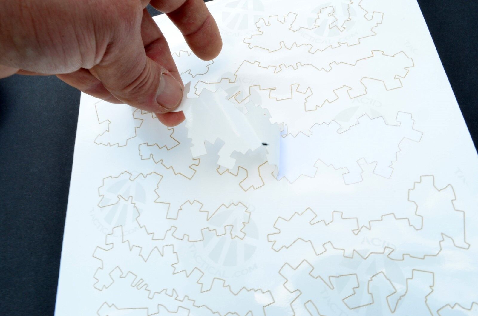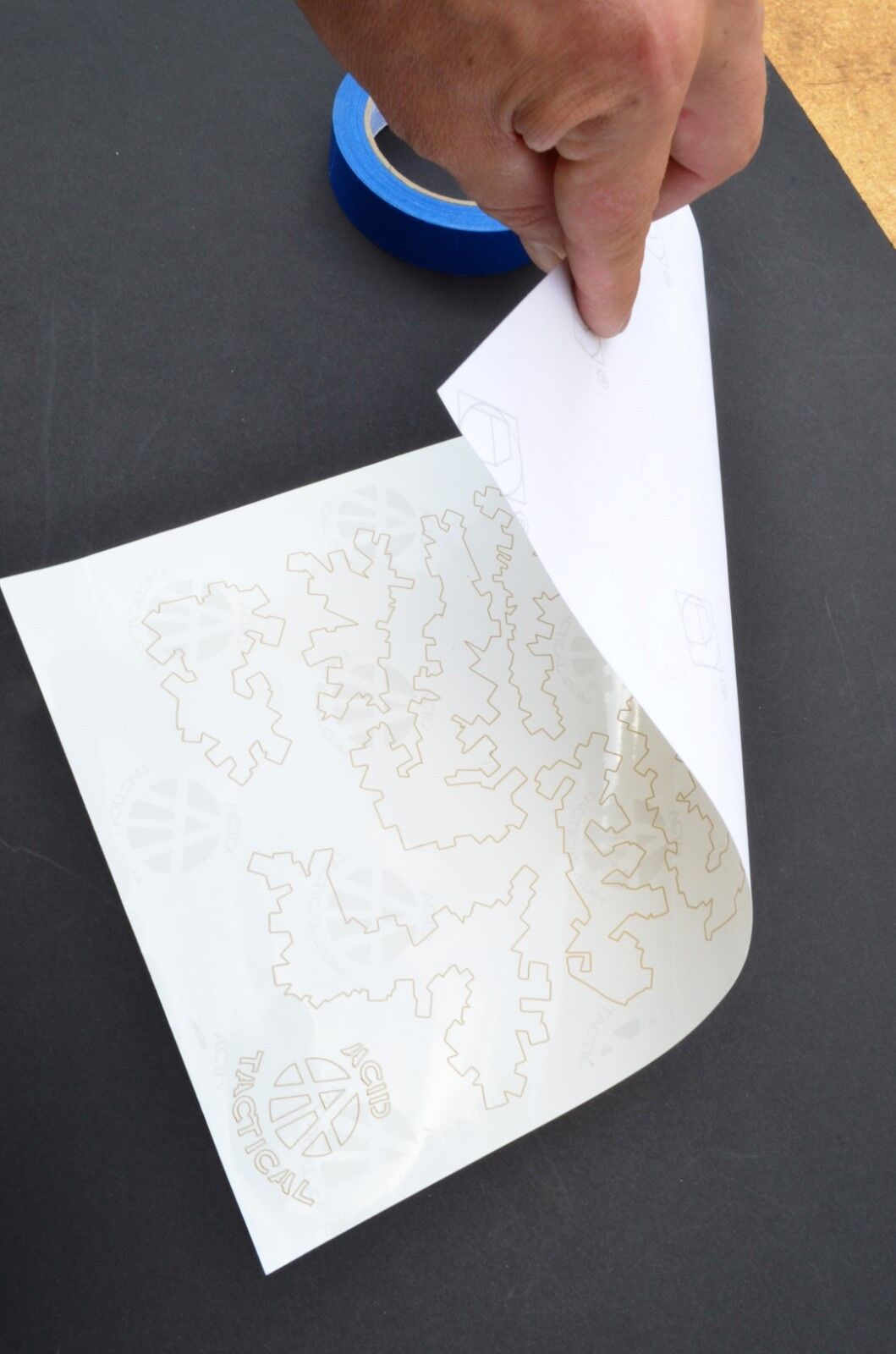 Acid Tactical ADHESIVE camo stencils. Our stencils will not leave sticky glue residue behind. They were designed to remove cleanly and not effect the paint. For use with airbrush, spray, gun coatings, duracoat, cerakote, and other spray paints. Stencils are heat resistant on both metal and polymers. They do not shrink on ABS and Polymers when flash curing like the yellow avery paper. They leave little to no adhesive behind so no messy clean up.